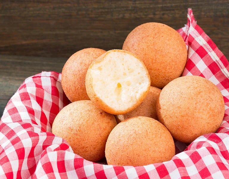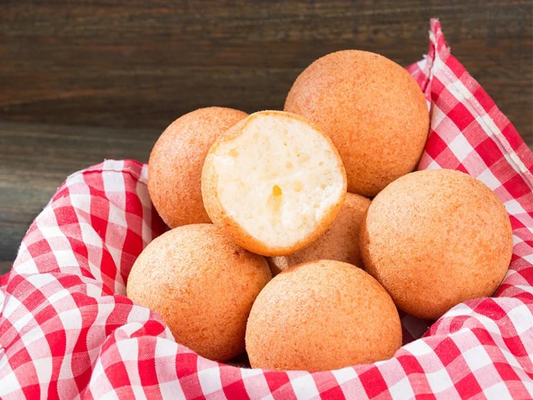 Luchtige, ronde deegbolletjes van kaas en maïsmeel, goudbruin gebakken. Warm geserveerd, knapperig van buiten en zacht van binnen, een echte Colombiaanse klassieker.